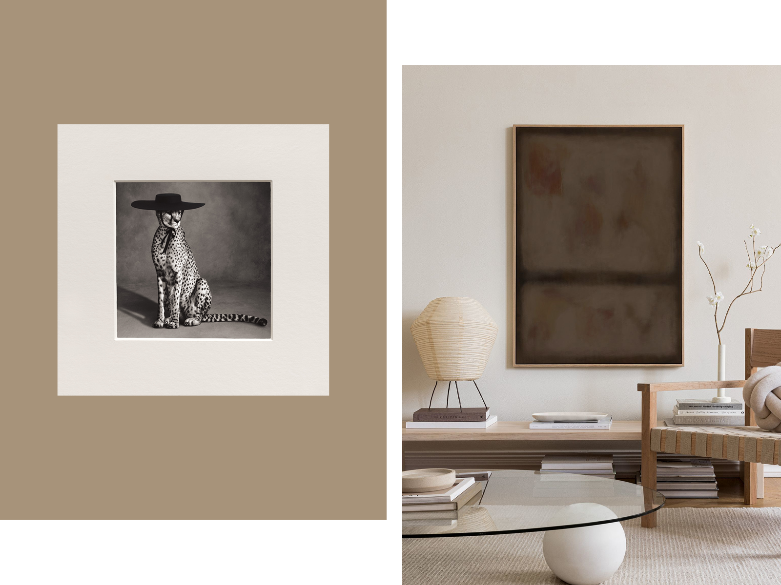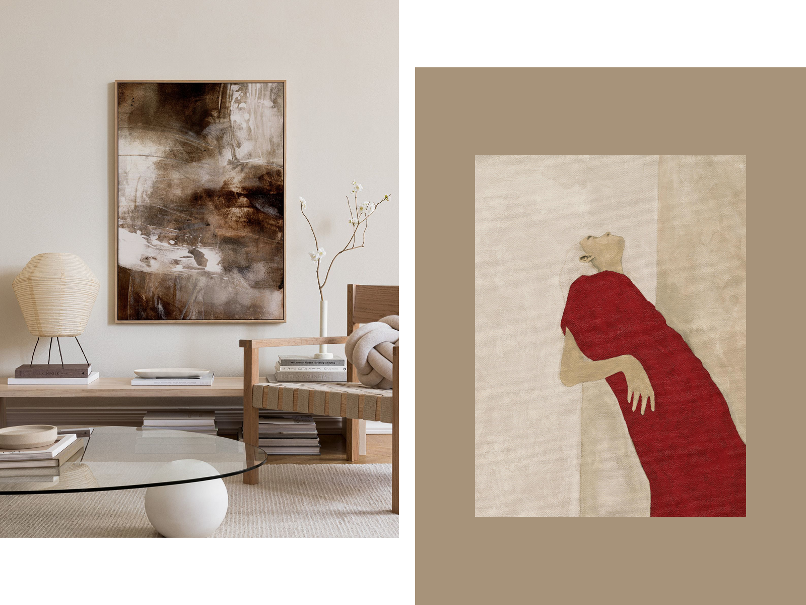 ”I det här urvalet har jag valt två stora abstrakta canvastavlor i jordnära bruna toner, inramade i vår vackra ekram, tidlösa statementverk som verkligen förankrar ett rum. Jag har även valt tre posters med röda accenter, eftersom jag ofta inspireras av figurativ konst och målade mönsterdetaljer. Dessutom har jag lagt till en av mina långvariga favoriter i sortimentet den klassiska fotopostern Photo Booth, samt Le Chasseur, vald helt enkelt utifrån min långvariga kärlek till leopardmönster.”