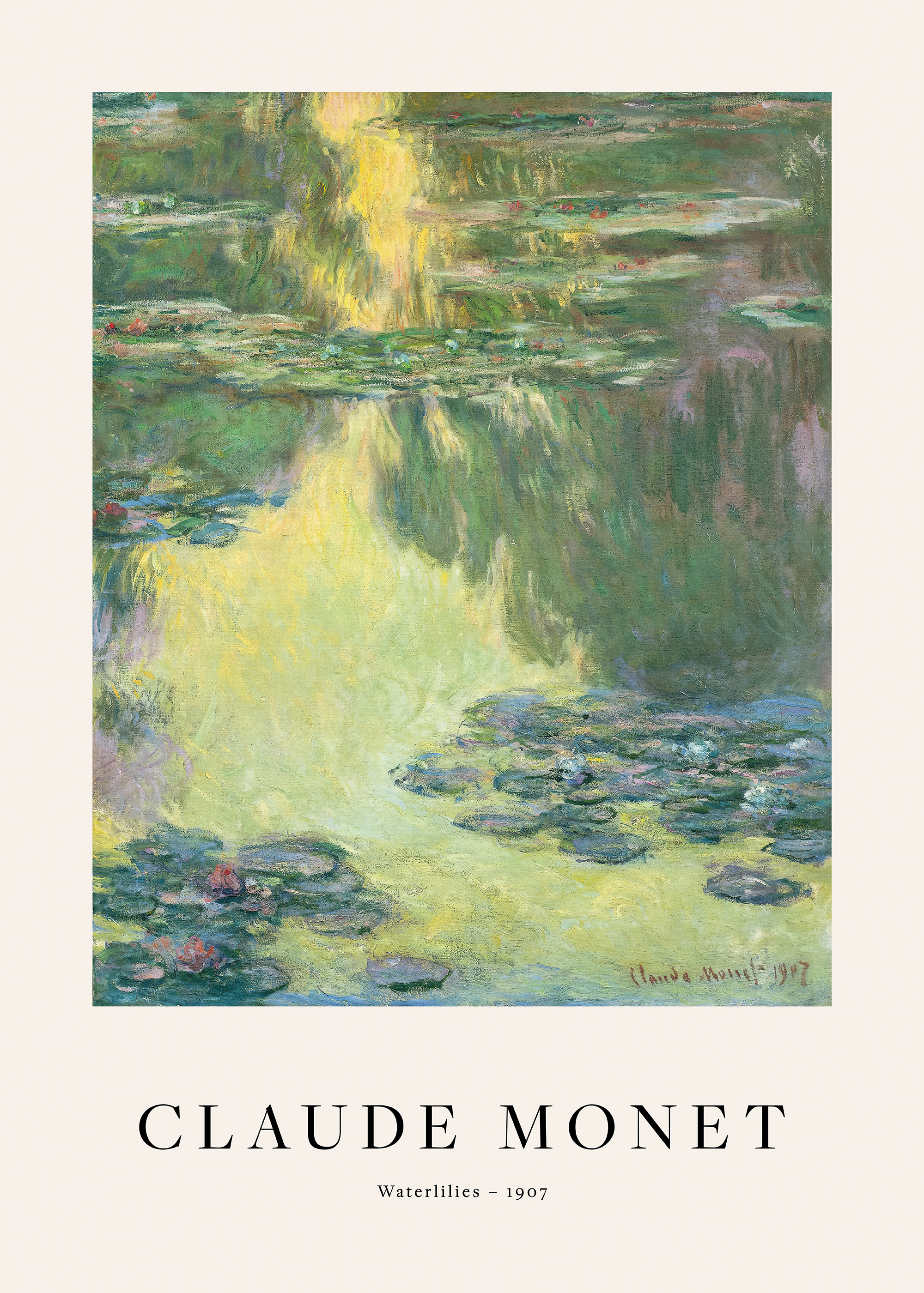 En tavelvägg med två Claude Monet-posters, en blommig poster och en fotoposter av gräsbevuxna sanddyner i beige och gröna toner.