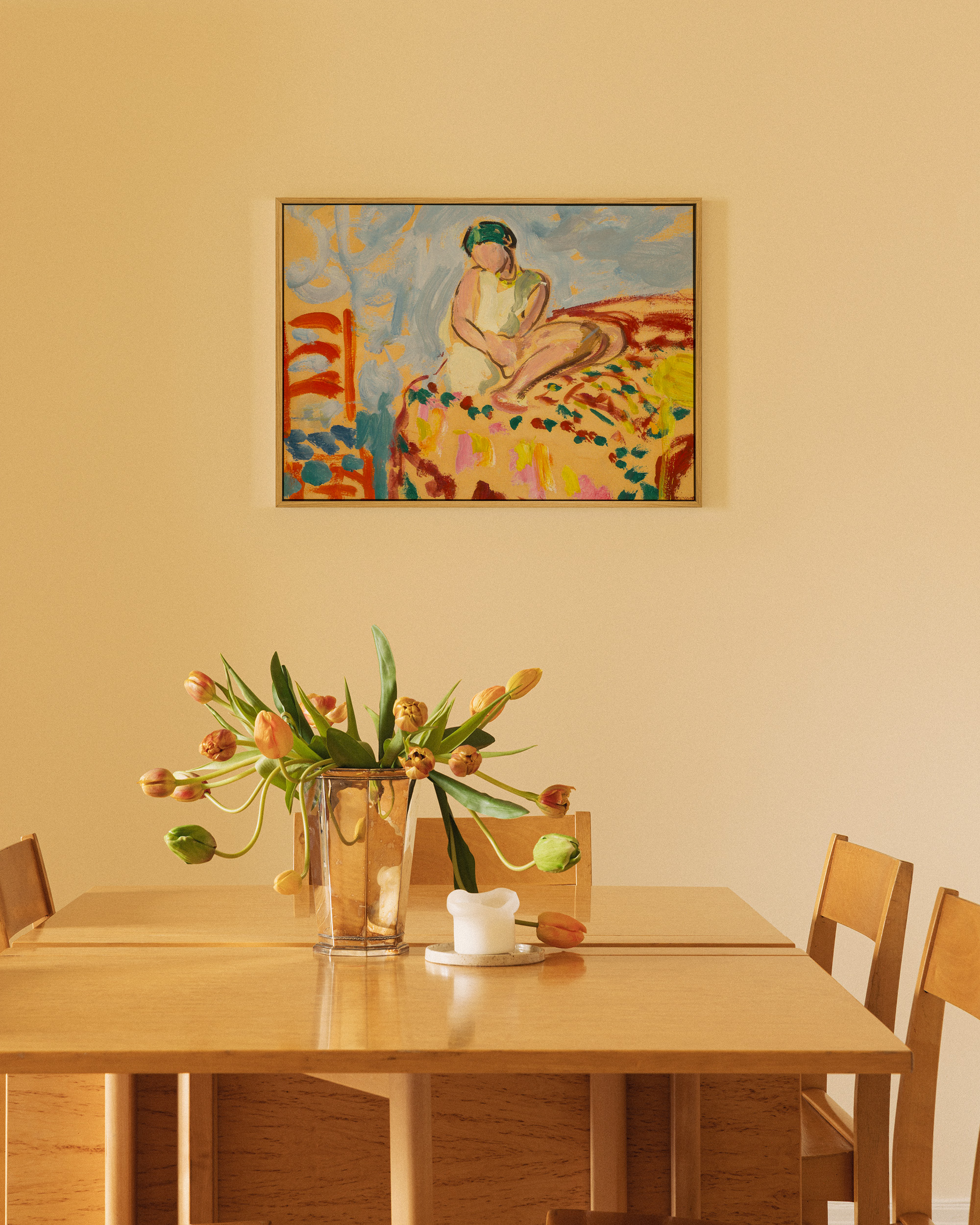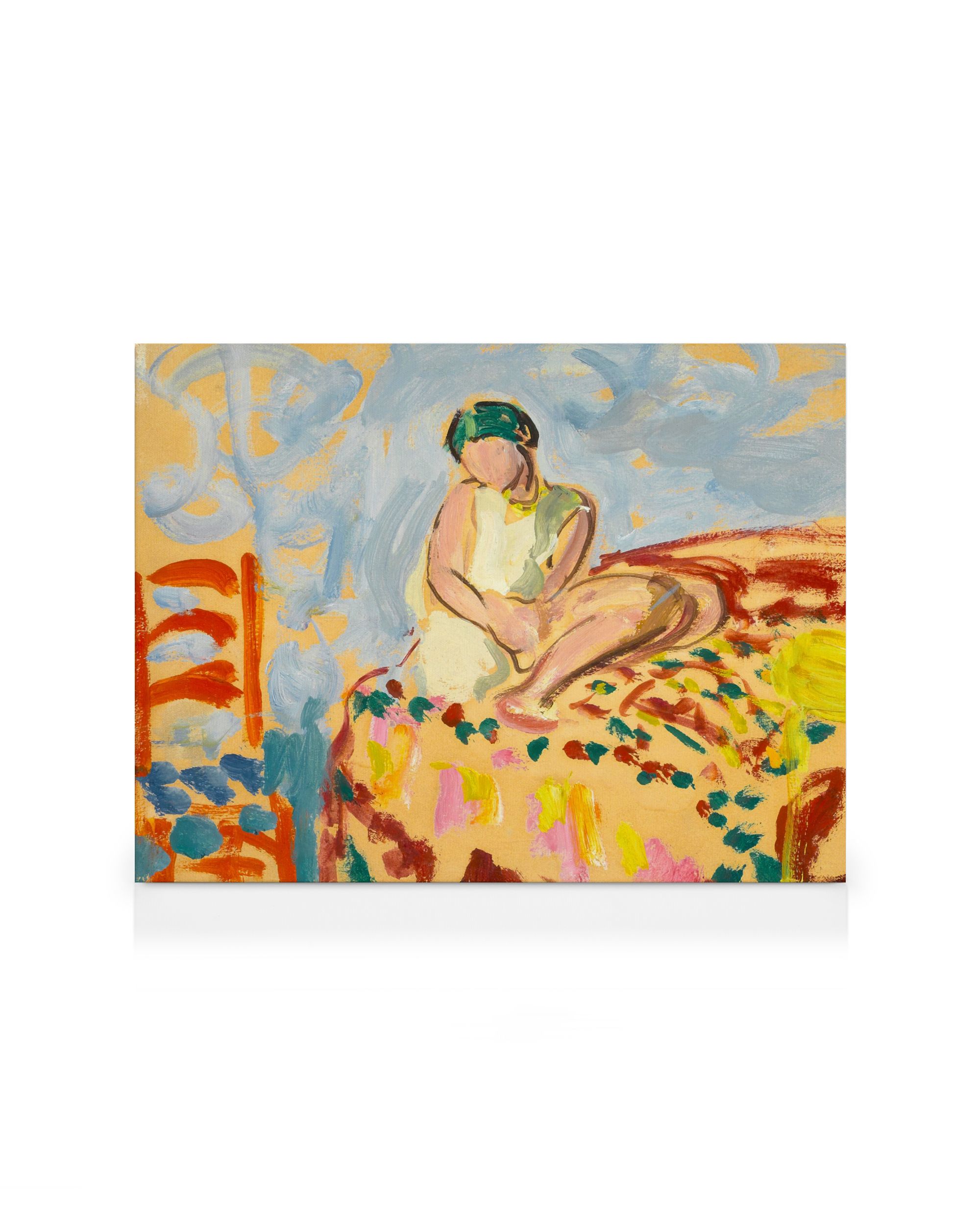 Från 249 krEn canvastavla som föreställer en person sittande på ett färgstarkt, mönstrat underlag. Motivet är målat i mjuka, jordnära toner med en ljusblå bakgrund med virvlar samt röda och orange former.