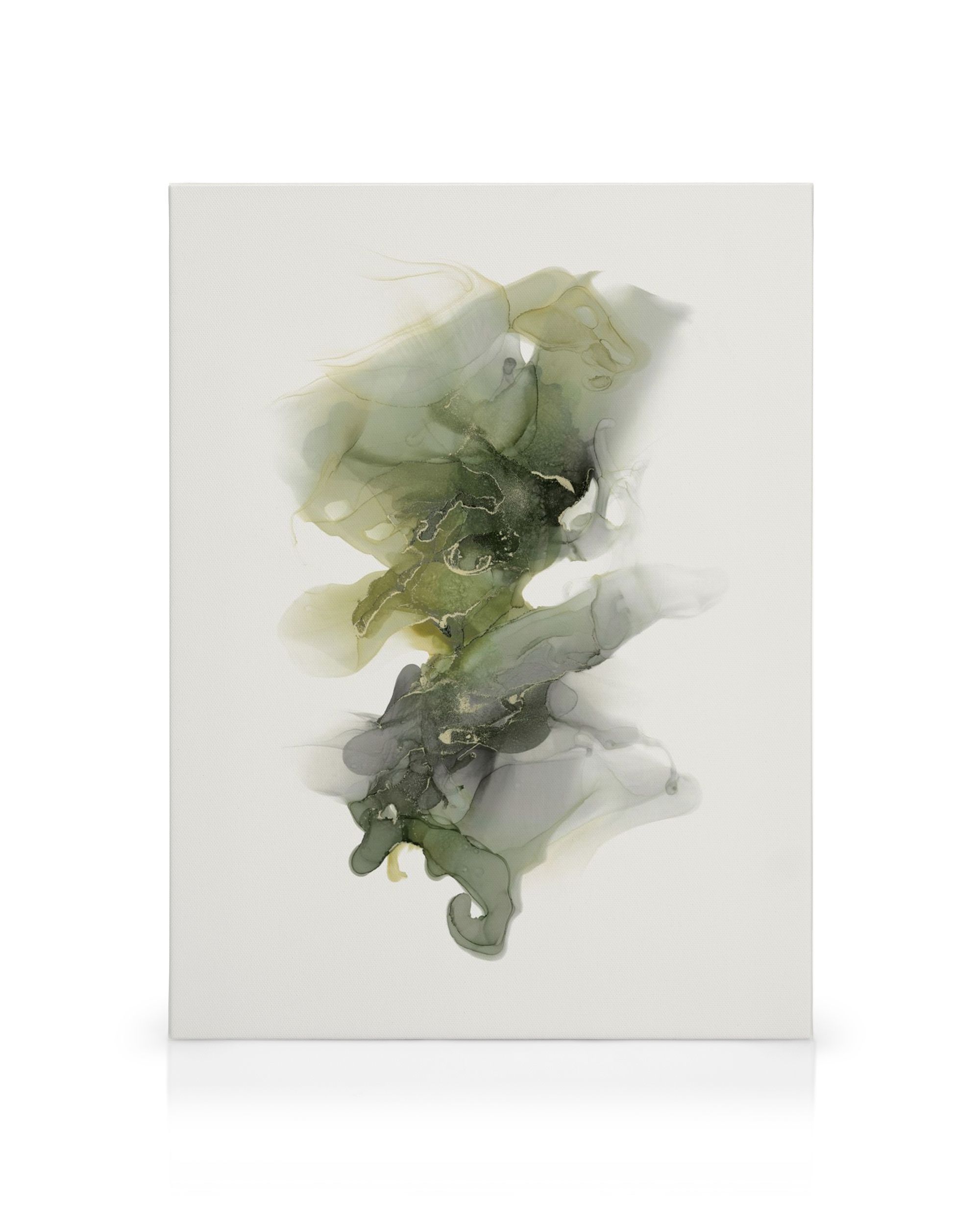 Från 145 krEn abstrakt canvastavla med flytande former i nyanser av grönt, gult och grått på en vit bakgrund. De mjuka kanterna och de släta texturerna på formerna liknar rök eller bläck i vatten.