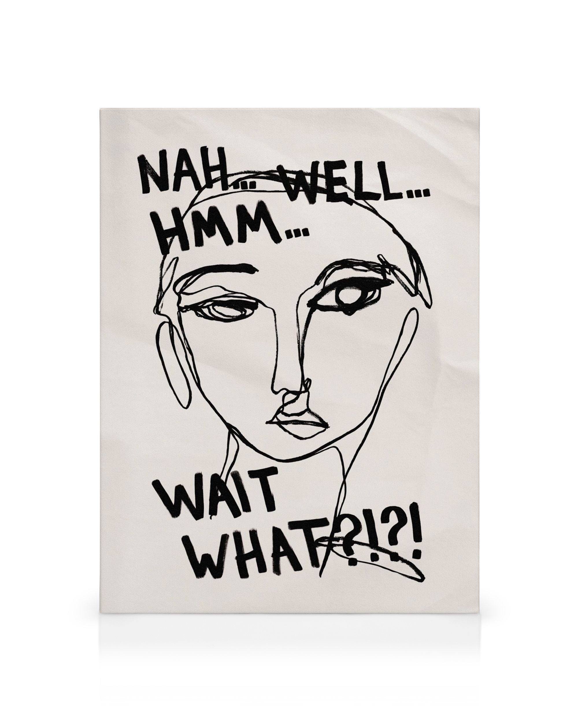 Från 249 krLine art canvastavla med en enkel skiss av ett uttrycksfullt ansikte, ena ögonbrynet höjt. De frågande fraserna "Nah Well... Hmm... Wait What?!?" omger porträttet och skapar ett fascinerande konstverk.