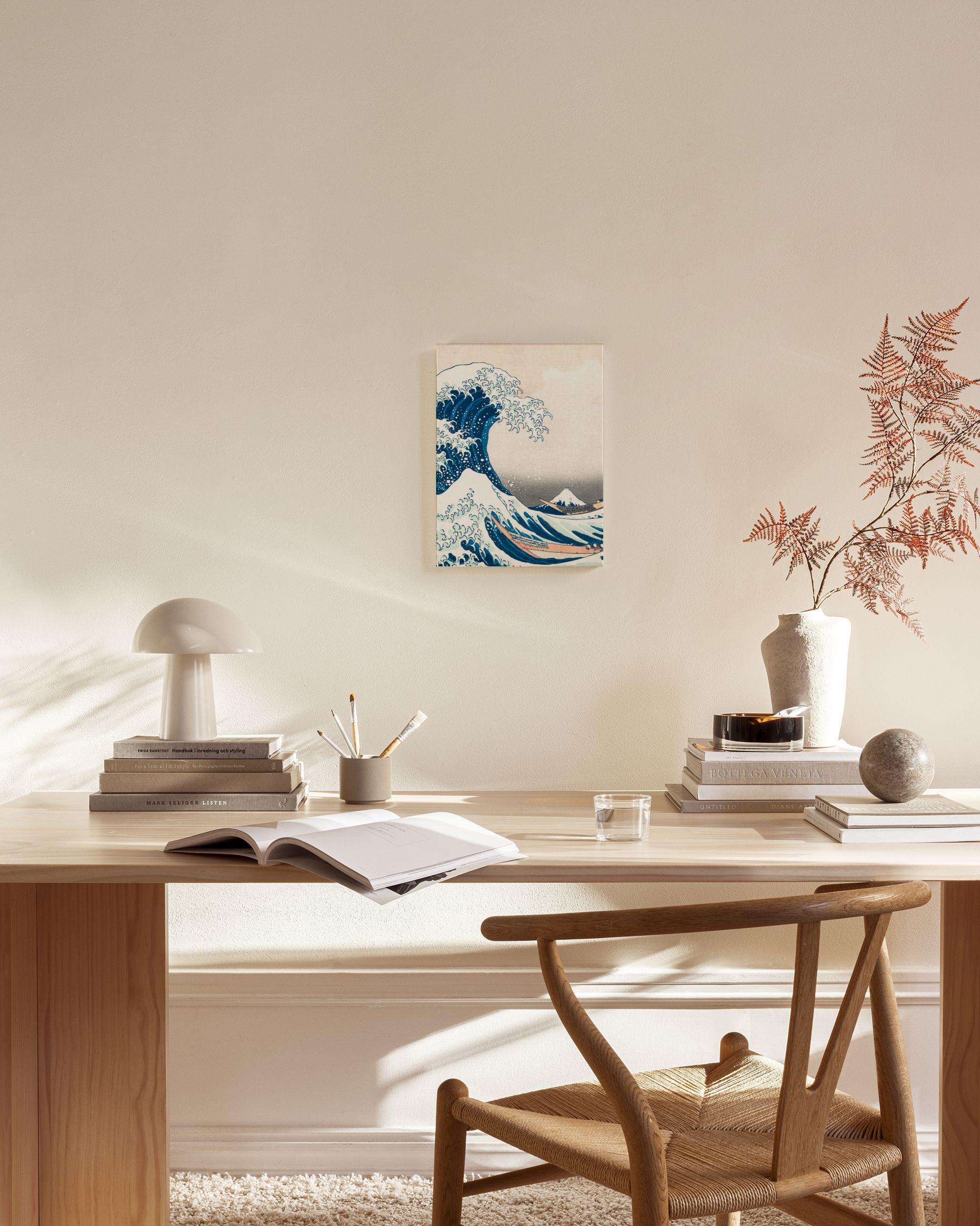 Från 129 krEn slående canvastavla som visar en stor blå och vit våg som krullar sig över huvudet, med en snöig bergstopp i bakgrunden. Den beige himlen har inslag av vitt, och vågens undersida avslöjar djupa nyanser av blått.