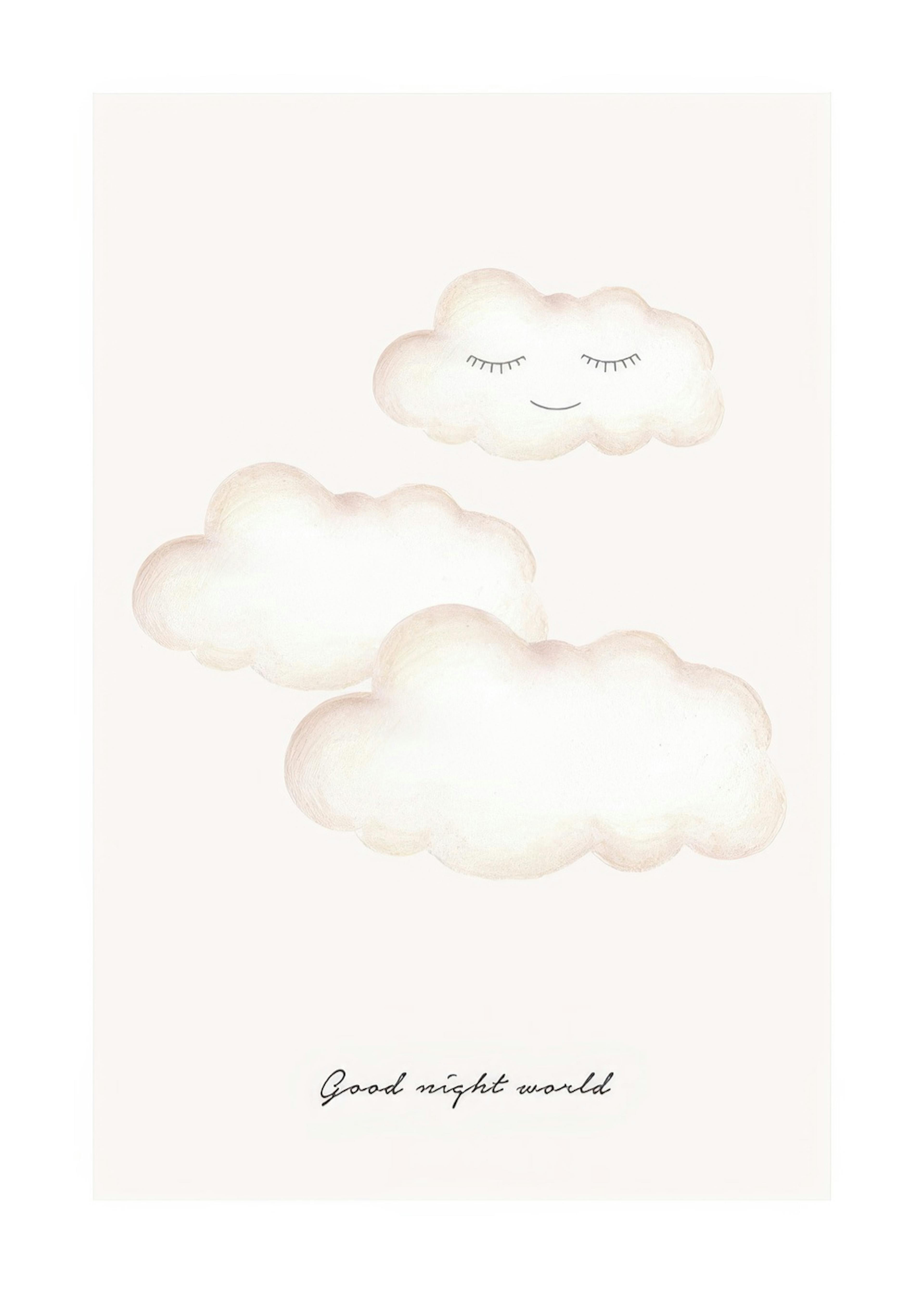 Akvarell av en babyelefant som sitter på en beige måne omgiven av moln, mot en beige bakgrund. Denna söta illustration är perfekt i en barnkammare eller ett barnrum, särskilt tillsammans med Dreaming Whale!