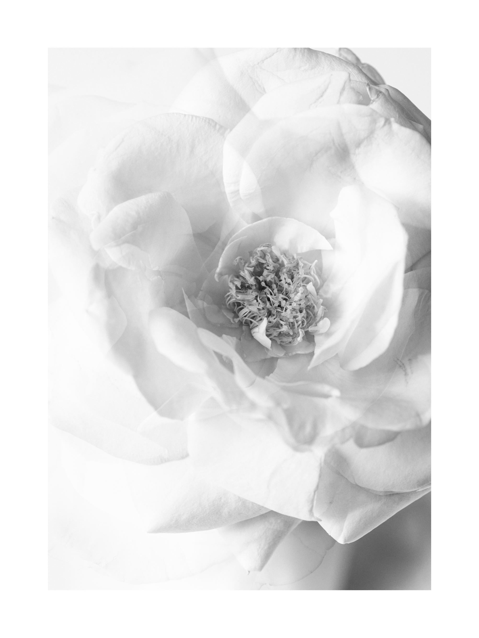 En närbild i svartvittvitt av en vit ros. Perfekt par med Still Life Rose No1. Postern är tryckt med en vit marginal runt bilden för att snyggt rama in designen.