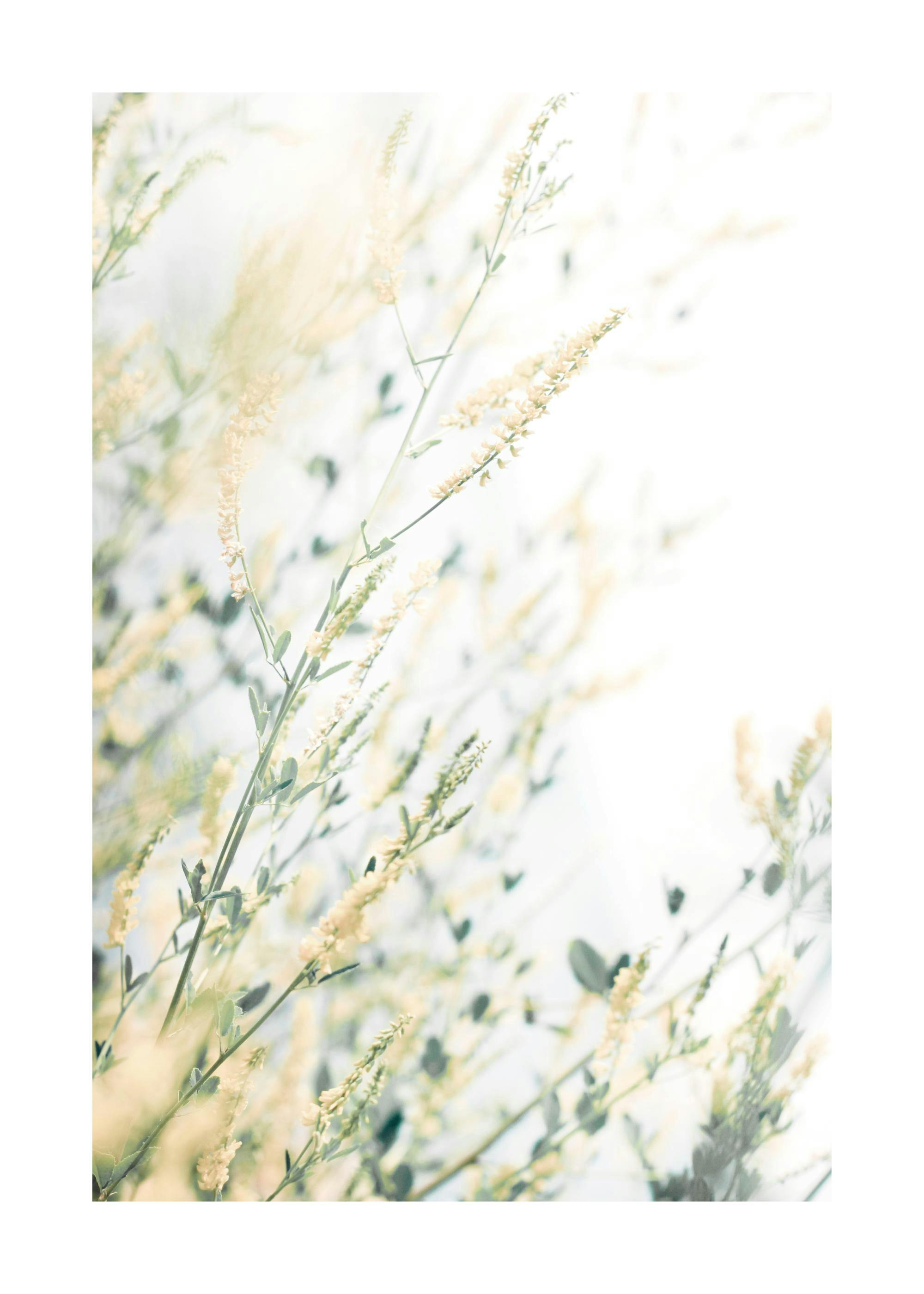 Fotografi av vilda, vita blommor omgivna av grönt gräs. Lägg till en drömmande och romantisk känsla i ditt sovrum med denna vackra poster, och kombinera den med andra blomposters för en komplett look!