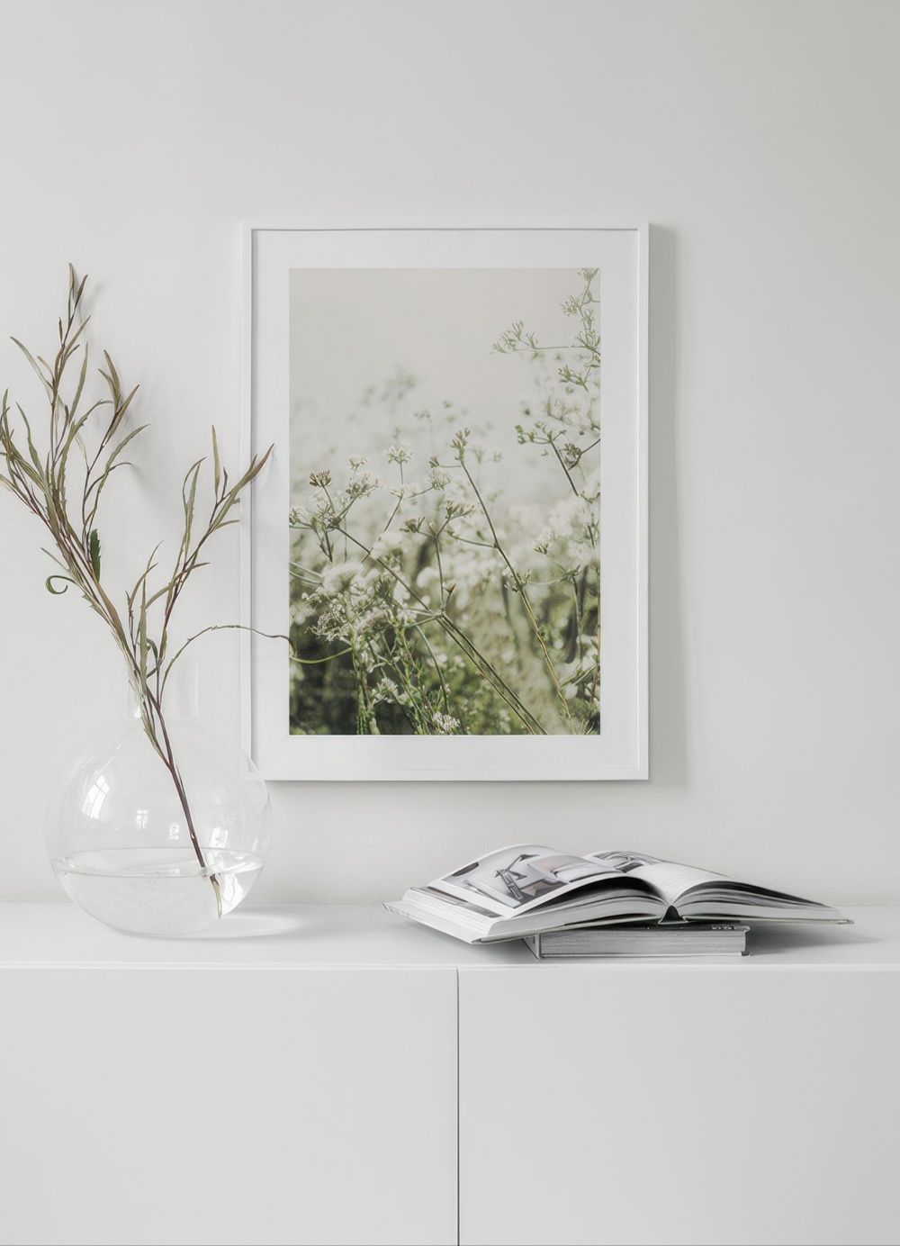 Fotografi av vilda, vita blommor omgivna av grönt gräs. Lägg till en drömmande och romantisk känsla i ditt sovrum med denna vackra poster, och kombinera den med andra blomposters för en komplett look!