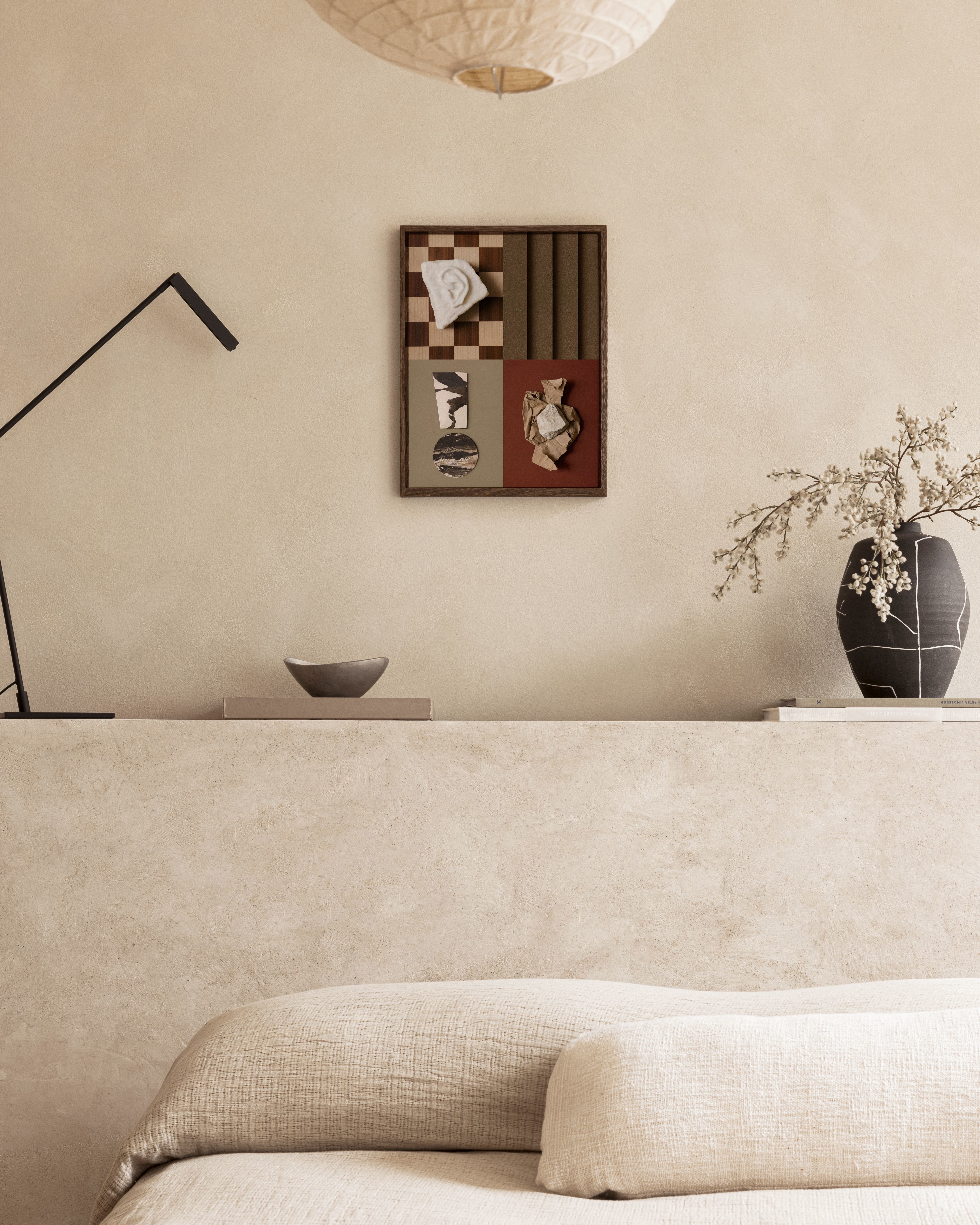 En poster som visar fyra olika fragment i bruna och beiga färger, med texturerat papper och naturliga material.