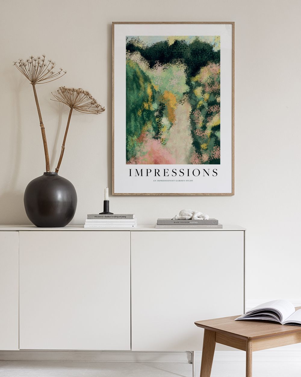 Abstrakt konstmotiv av en grön trädgård med blommande blommor. Sätt din prägel på din inredning med detta trendiga konstmotiv. Perfekt par med Impressions No1.