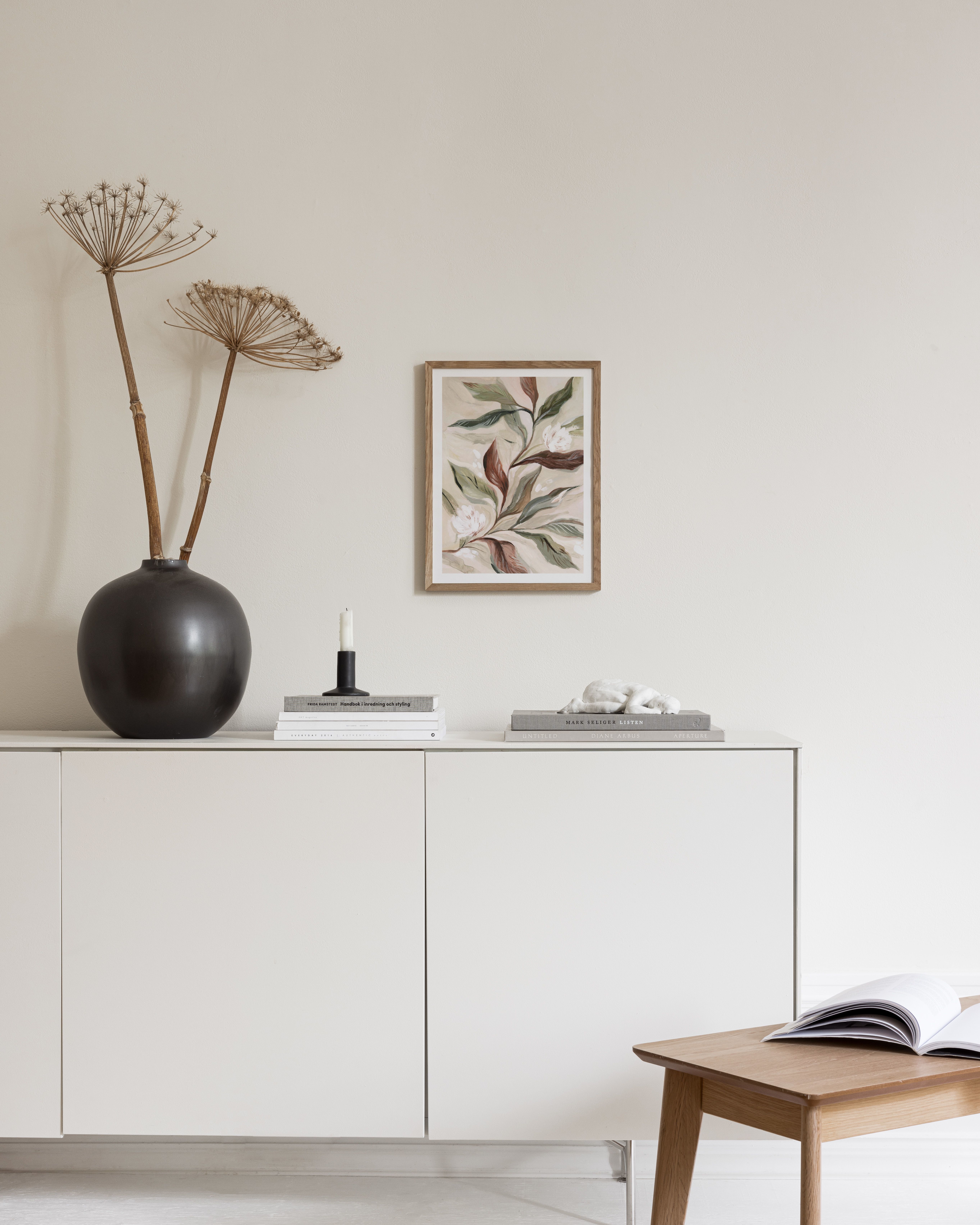 Rustik botanisk väggkonst med mjuka gröna och bruna blad. Vita blommor på en krämig bakgrund. Handmålad poster ger en lugn, naturlig känsla till vilket rum som helst.