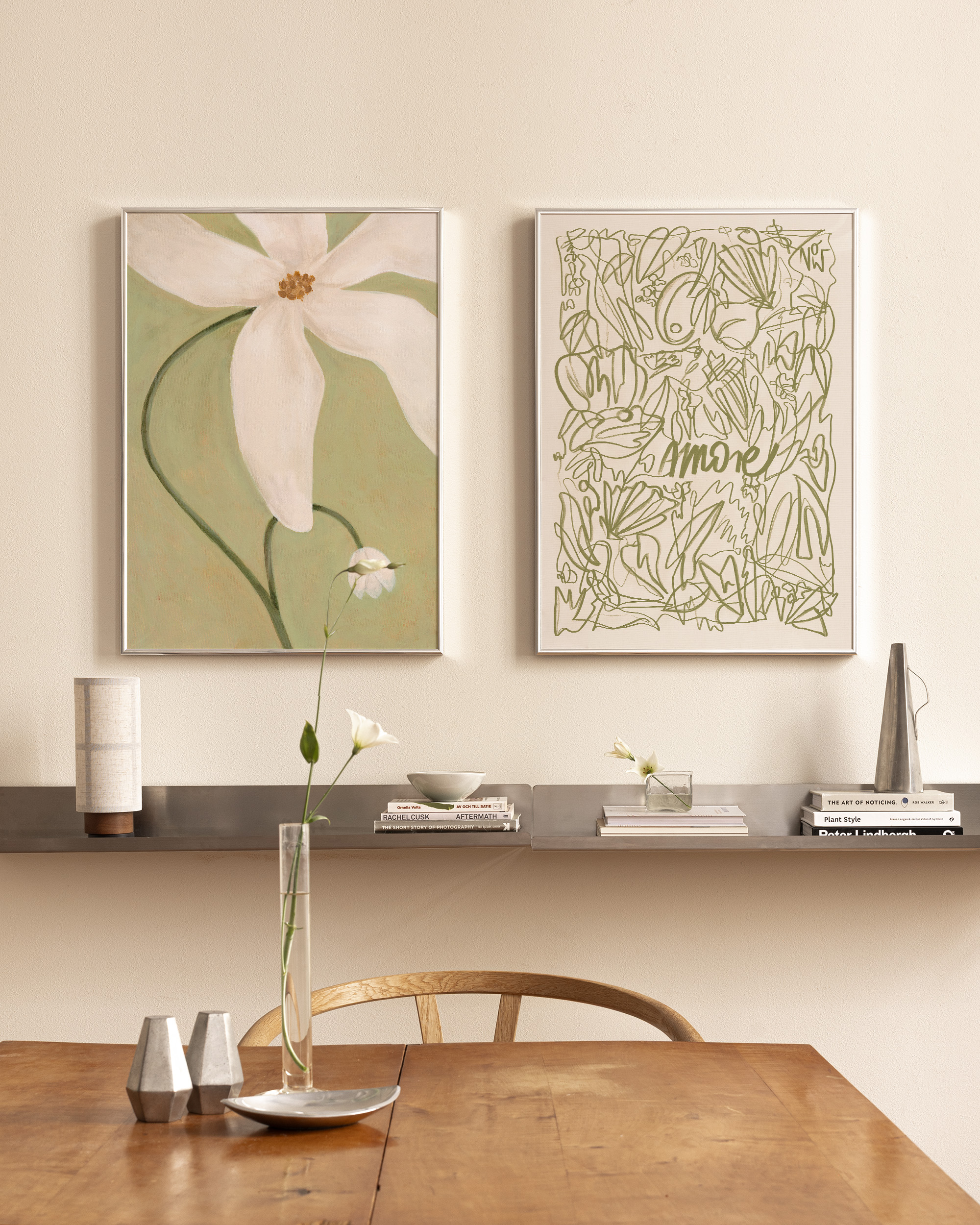 Från 239 krEn poster föreställande en stor vit blomma med mjuka kronblad och grön stjälk mot en ljusgrön bakgrund. Enkel och elegant väggkonst med ett minimalistiskt uttryck.