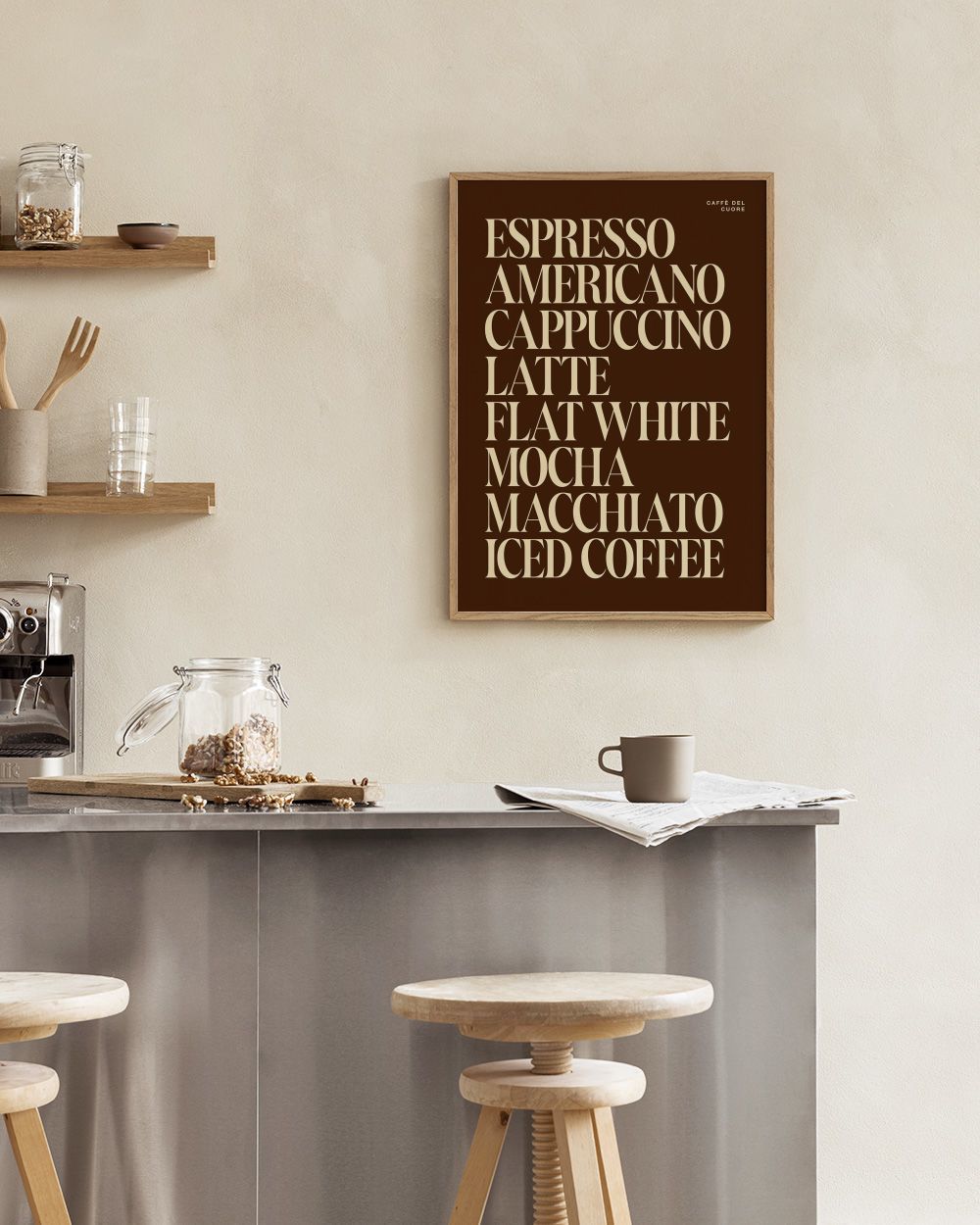 Stilren kaffeposter med djärv cremefärgad text på brun bakgrund. Visar populära sorter som Espresso, Latte och Flat White. En perfekt poster för ditt kök eller kaffehörna.