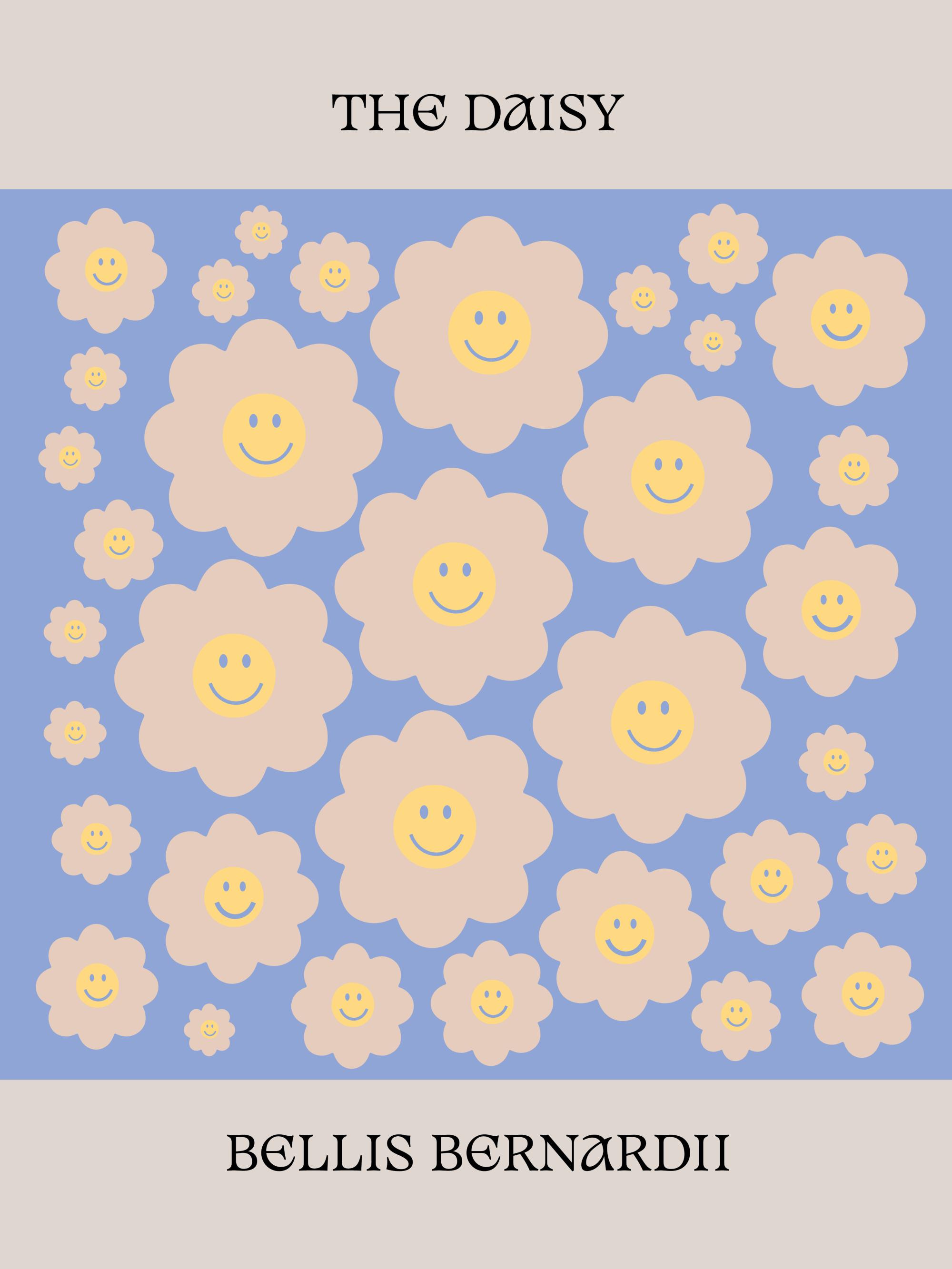 Färgstark poster med smileyansikten i blommor på blå bakgrund. Postern har texten 'The Daisy' ovan och 'Bellis Bernardii' nedan som är det vetenskapliga namnet för den korsikanska tusenskönan. En perfekt poster för en blomsterälskare. Matchar perfekt med 'The Daisy No2'.