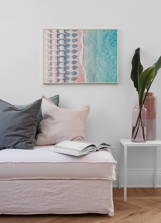 Fotoaffisch med motiv på en strand med parasoller